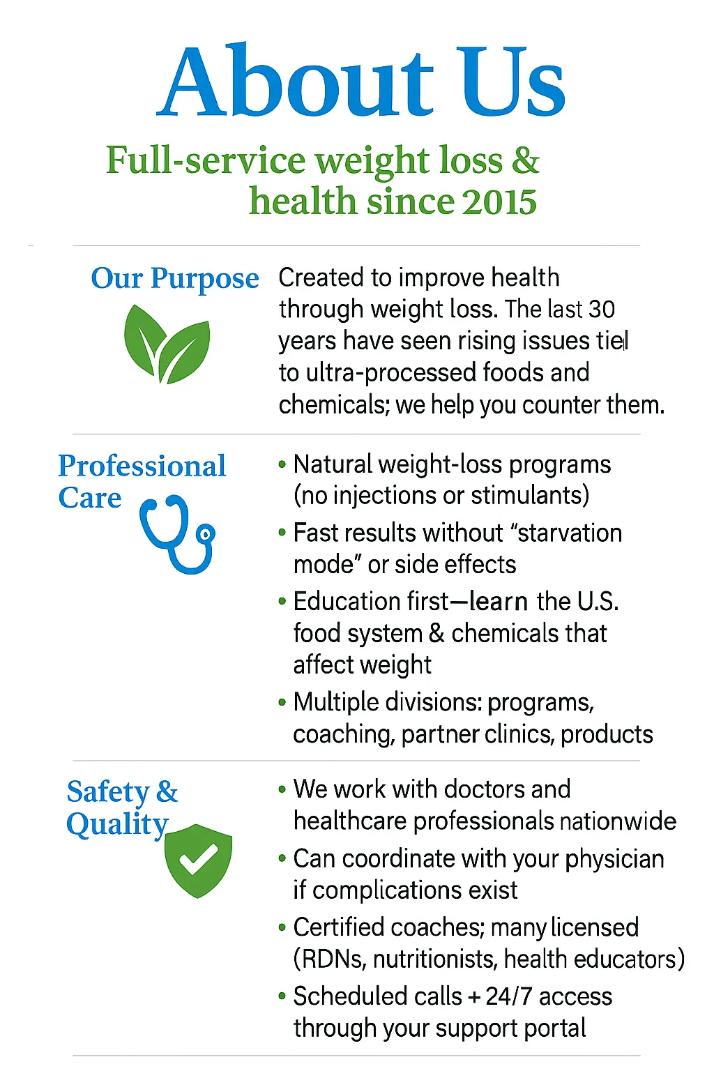Pro Weight Loss is a full-service weight-loss and health company founded in 2015 to address a growing need: improve health outcomes by helping people safely reduce excess weight. Full service means we carry and/or control almost all weight-loss methods on the market today, including GLP-1 medications. Decades of highly processed food, added sugars, and poor nutrition have contributed to rising metabolic and inflammatory problems. Our mission is to make weight loss simple, natural, and sustainable—and to teach the everyday skills that keep results for life.